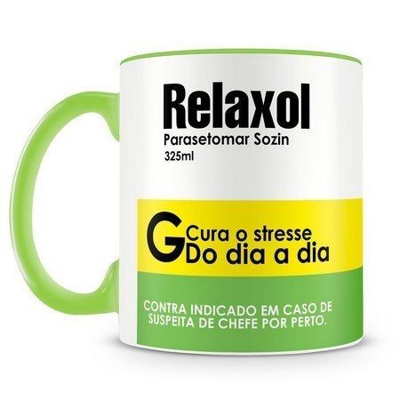 Caneca em porcelana de primeira linha estilizada como caixa de remédio de forma cômica denominado “Relaxol”.